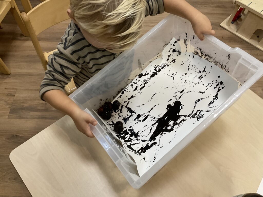 De herfst is begonnen. Kinderen gaan met de kastanjes rollen in de verf en weven een eigen spinnenweb. Rollen heen en weer en ontdekken wat het effect is. Ondertussen zingen we, de spin wiedewin!