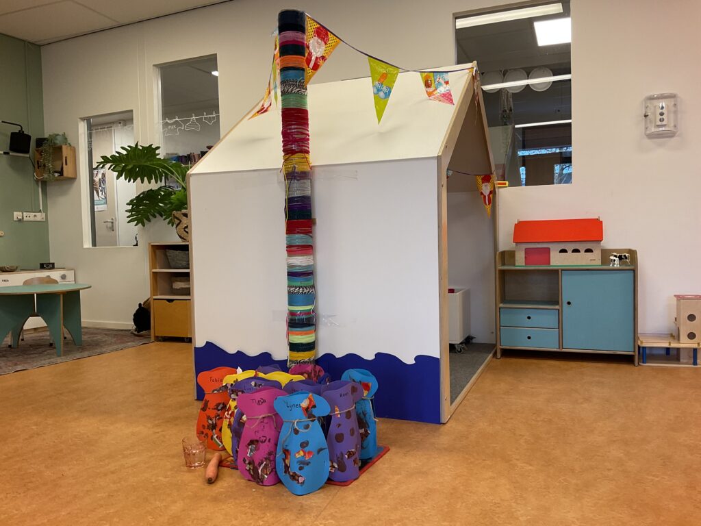 Het is natuurlijk niet handig om je schoen op school te zetten… dan moet je op een sok naar huis! Daarom hebben we een mooie zak geknutseld en zingen we bij de schoorsteen het hoogste lied.
