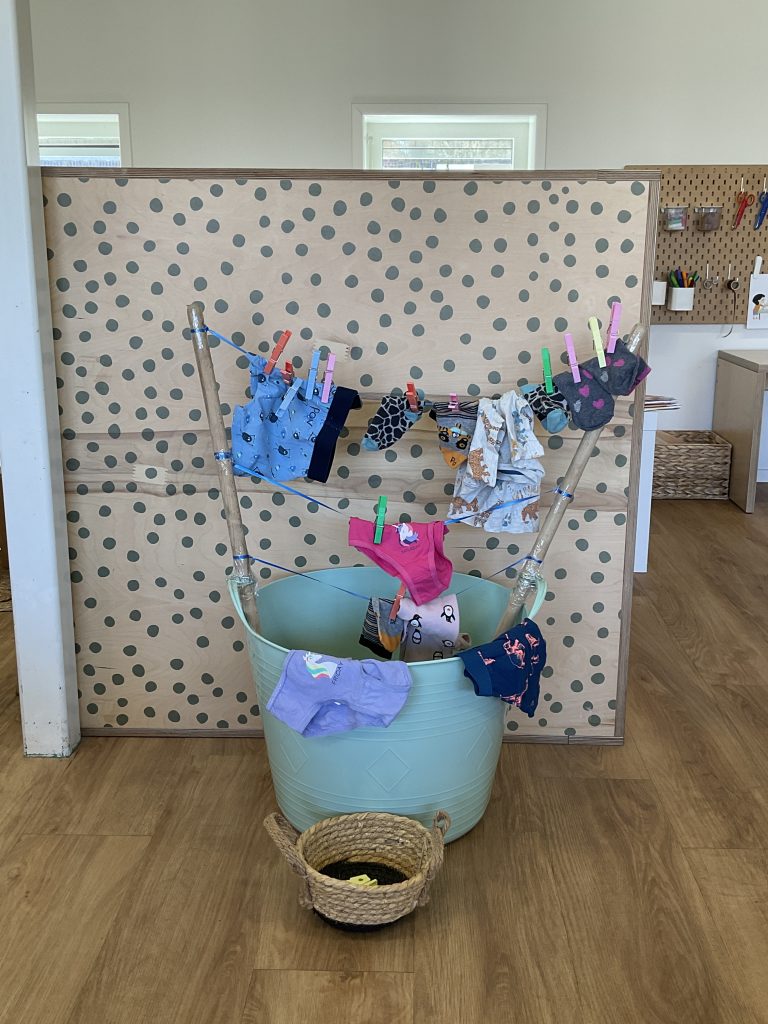 We hangen de was op met knijpers en leren ondertussen nieuwe woorden, zoals sokken, hemd en onderbroek.