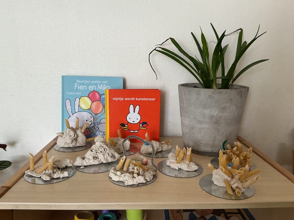 Wij maken onze eigen kunstwerken op papier en met klei. We poseren in een schilderij en verven op het raam. Van flesjes maken we muziekinstrumenten, gevuld met natuurlijk materiaal, voor ons eigen natuurconcert.