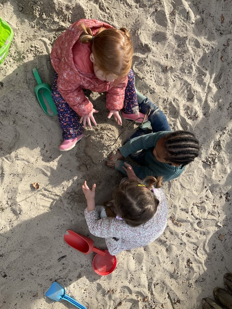 In de zandbak valt weer veel te spelen, samen maken wij een zandkasteel met een stokje als vlag!