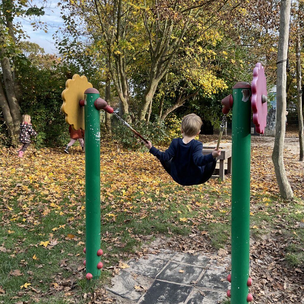We spelen lekker op het plein tussen alle kleurige herfstblaadjes!