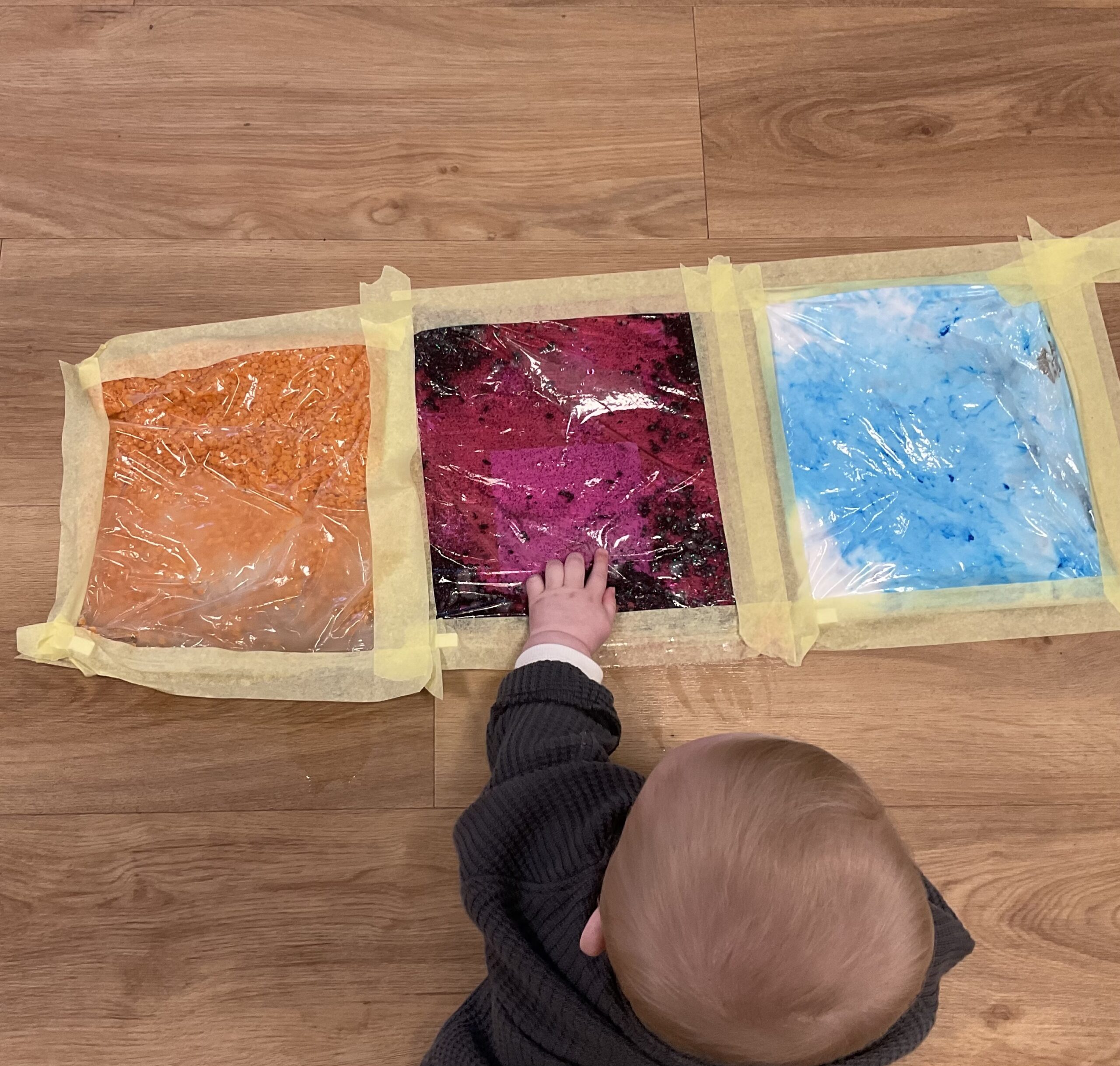 Een baby ligt op zijn buik en ontdekt kleurrijke sensorische zakjes. Door te kijken, voelen en duwen worden zijn zintuigen en motoriek gestimuleerd. Zo leert hij de wereld stap voor stap kennen.