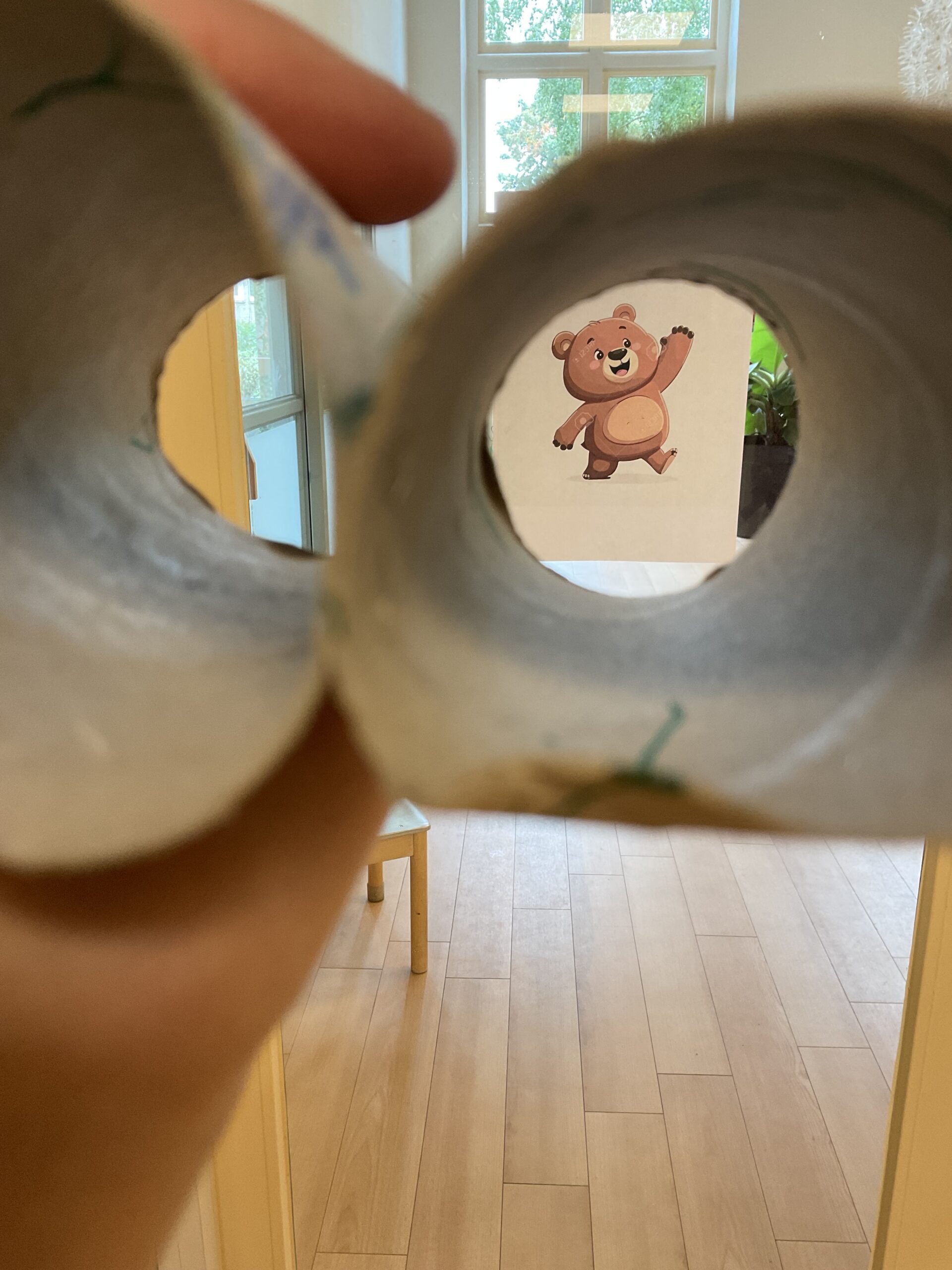Samen een verrekijker kleuren en op zoek naar 4 beren die verstopt zijn.