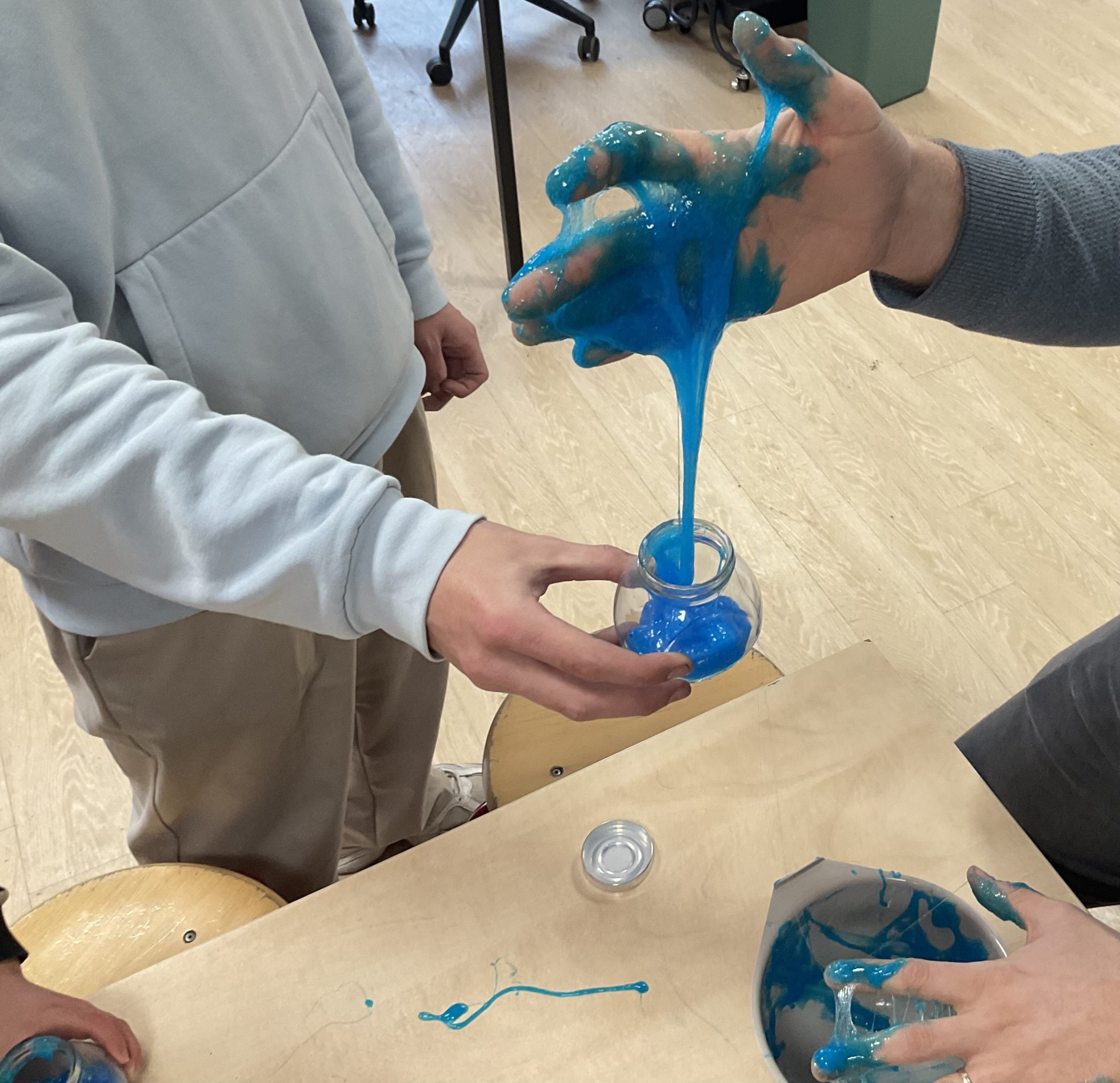 We maakten zelf slijm in winterthema. Door de kleur lijkt het net bevroren! Het slijmproces was zo leuk dat zelfs de juffen en meesters enthousiast meededen.