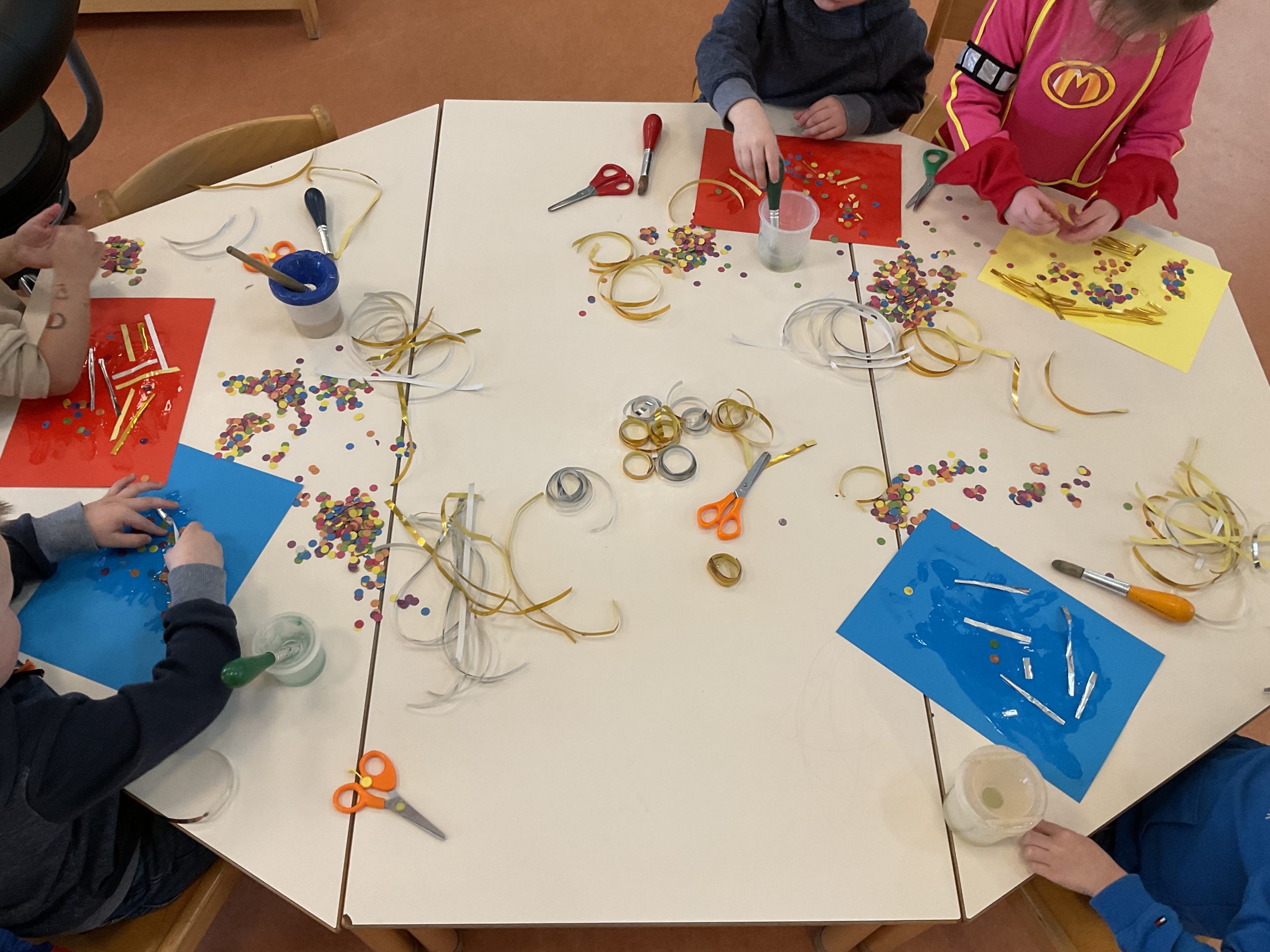 Een carnaval knutsel! Daar hoort natuurlijk confetti en serpentine bij. Zelf de serpentine knippen en een mooie creatie plakken met de confetti.