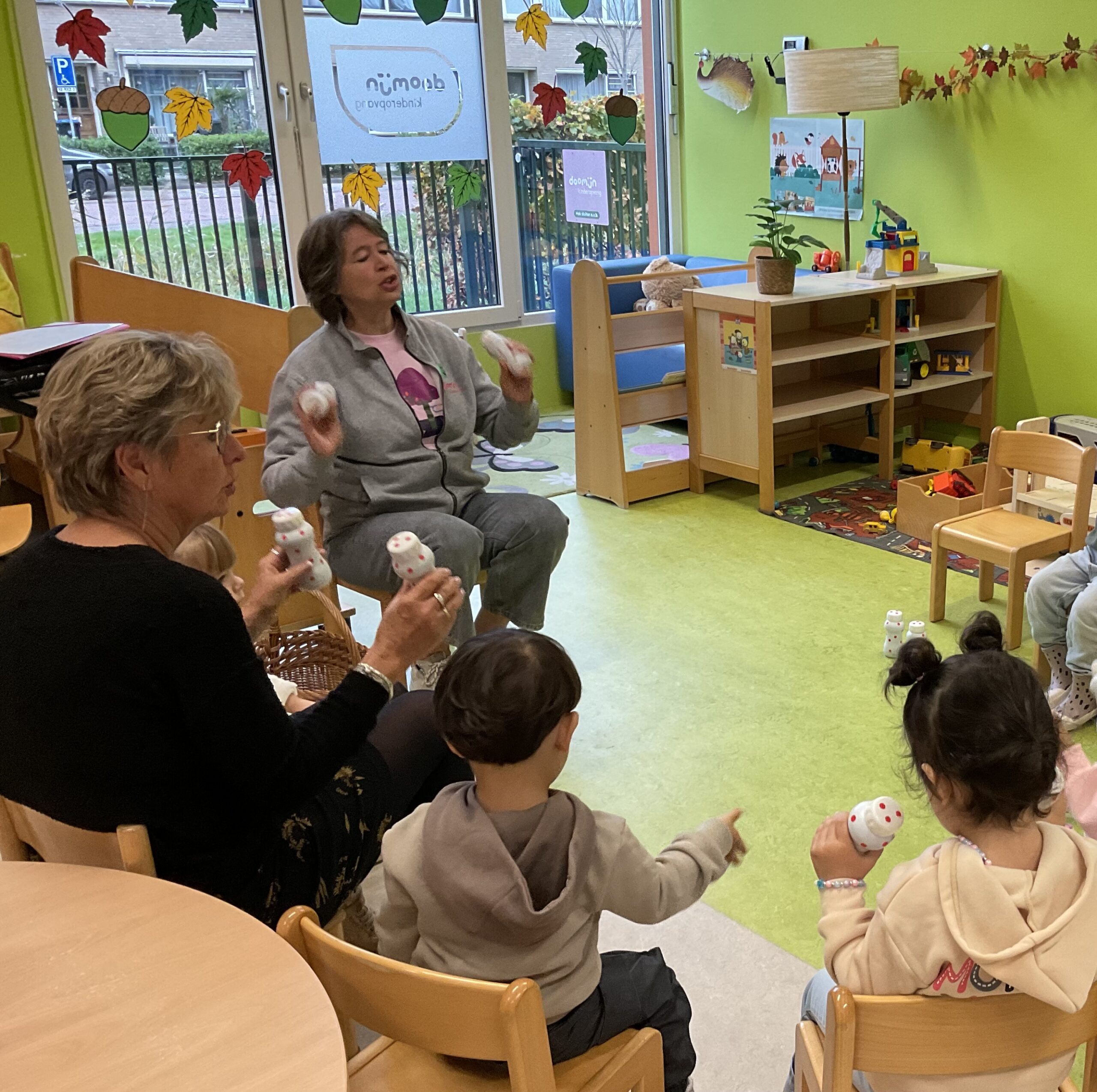 Nog meer bezoek vandaag: Daniëlla, muziekconsulente van Doomijn, kwam zingen en muziek maken over het thema herfst. Blaadjes, egeltjes, spinnen, het kwam allemaal voorbij!