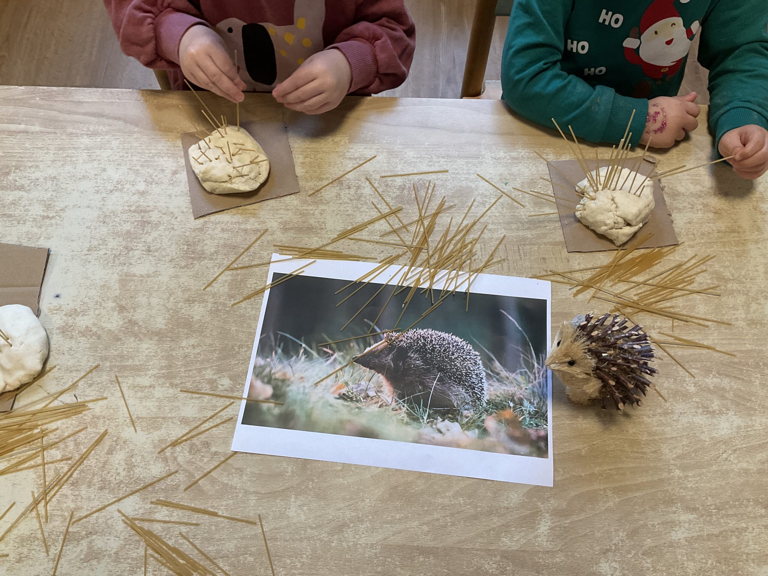Vandaag was de egel het onderwerp van ons kringgesprek. Daarna tijd om de egel met zijn scherpe punten zelf te maken met zoutdeeg en spaghetti.
