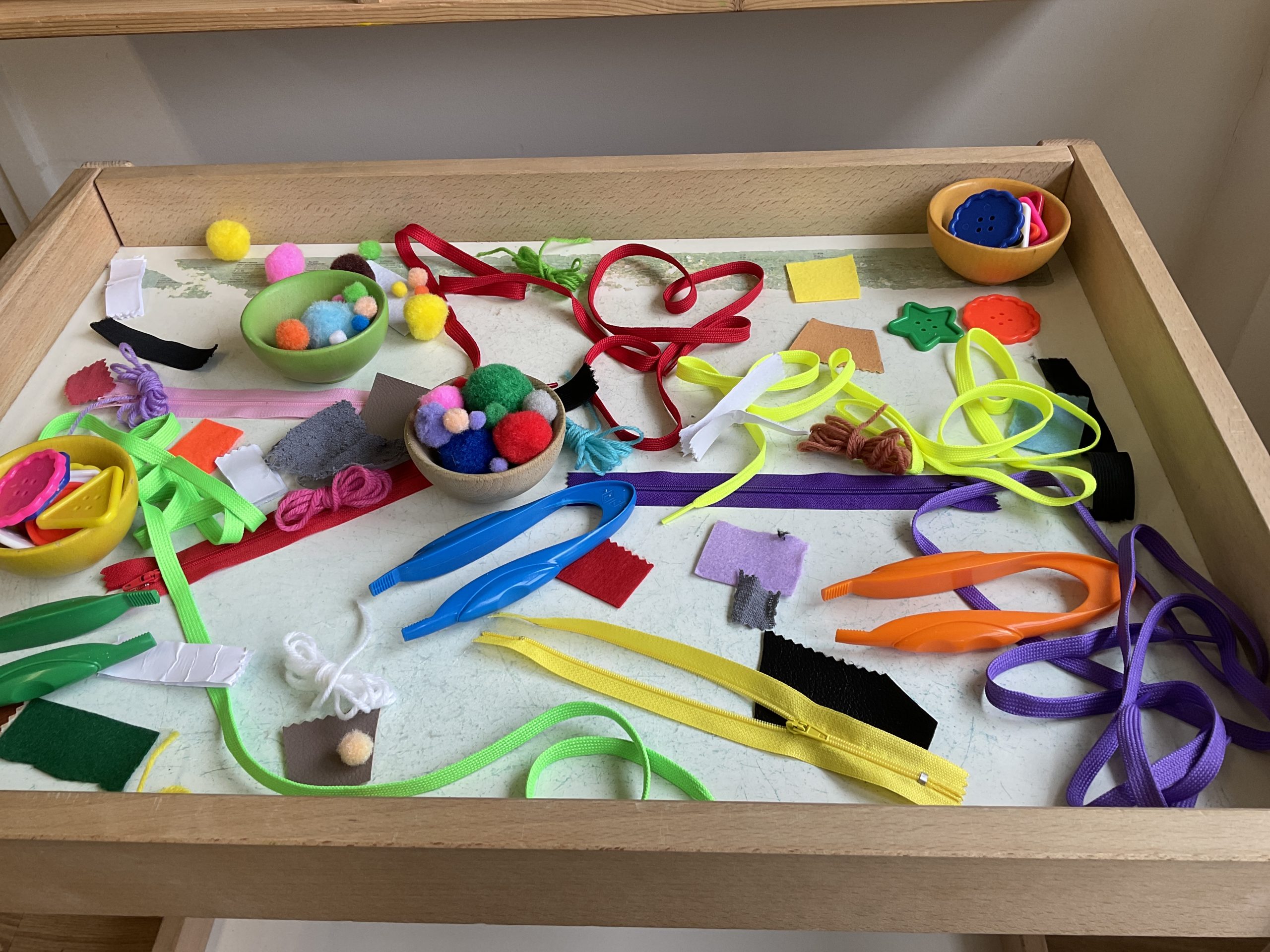 In de sensomotorische bak liggen ritsen, klittenband, knopen, wol, stukjes stof, elastiek, veters e.d. De peuters kunnen hier aan voelen en mee experimenteren.