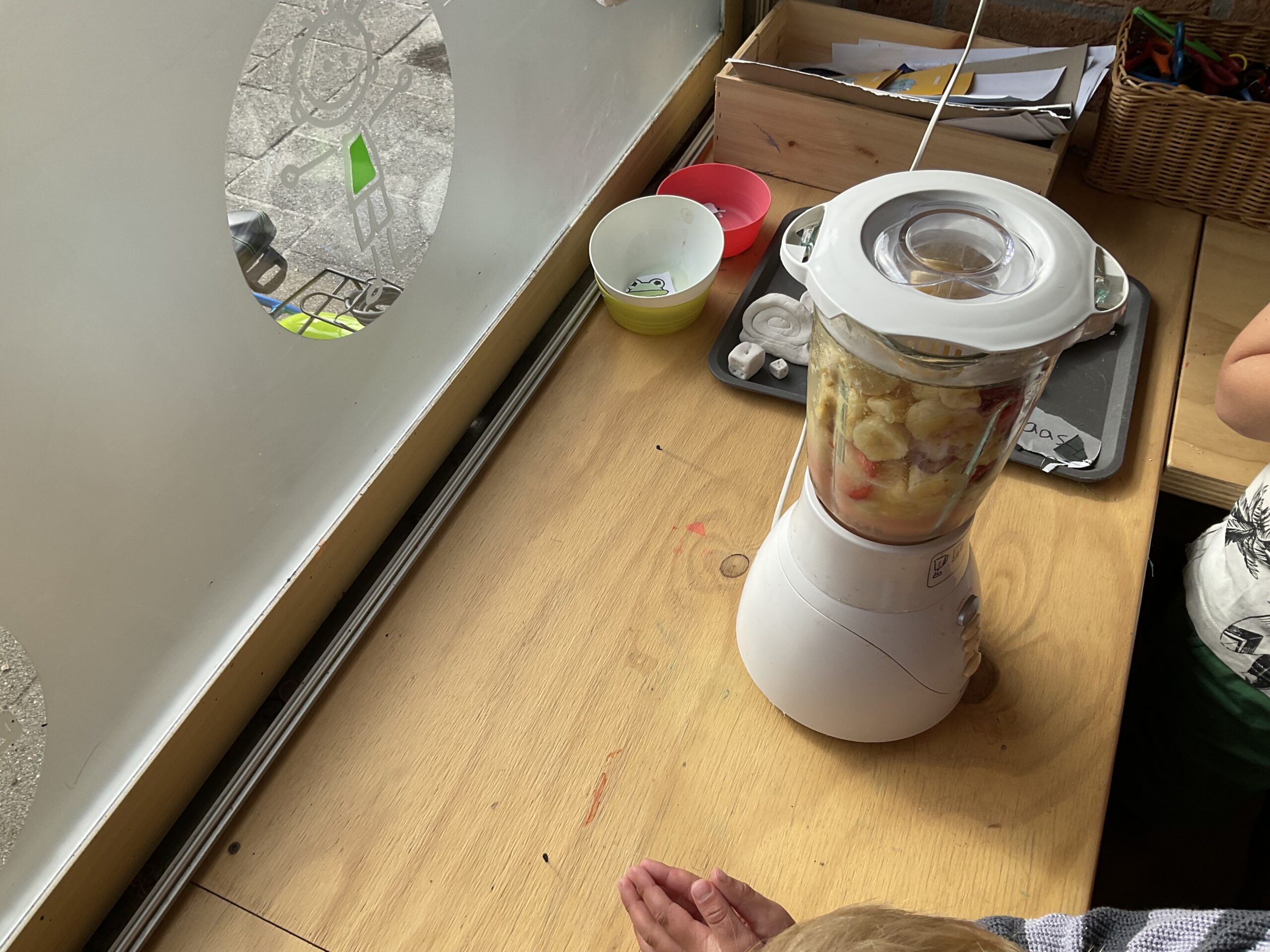 Vandaag gaan we wat lekkers maken. We kiezen welk fruit, snijden het fruit is kleine stukjes, ijsblokjes erbij en wachten tot het klaar is. Mmm, daarna lekker smullen maar.