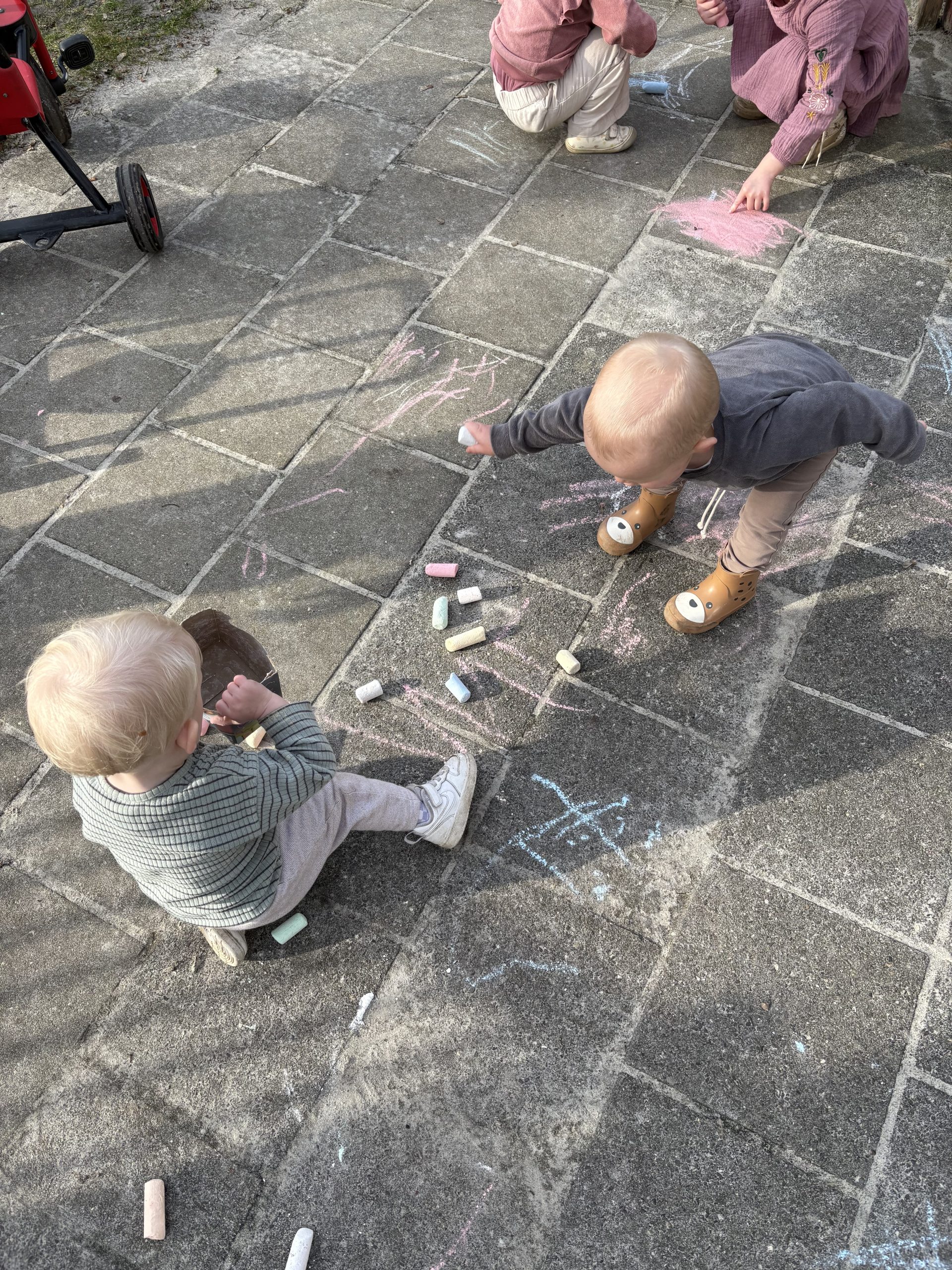 Wat is het heerlijk weer vandaag! We gaan met z’n allen naar buiten en ook de jongsten doen gezellig mee met stoepkrijten. Wat fijn om weer lekker veel buiten te spelen.