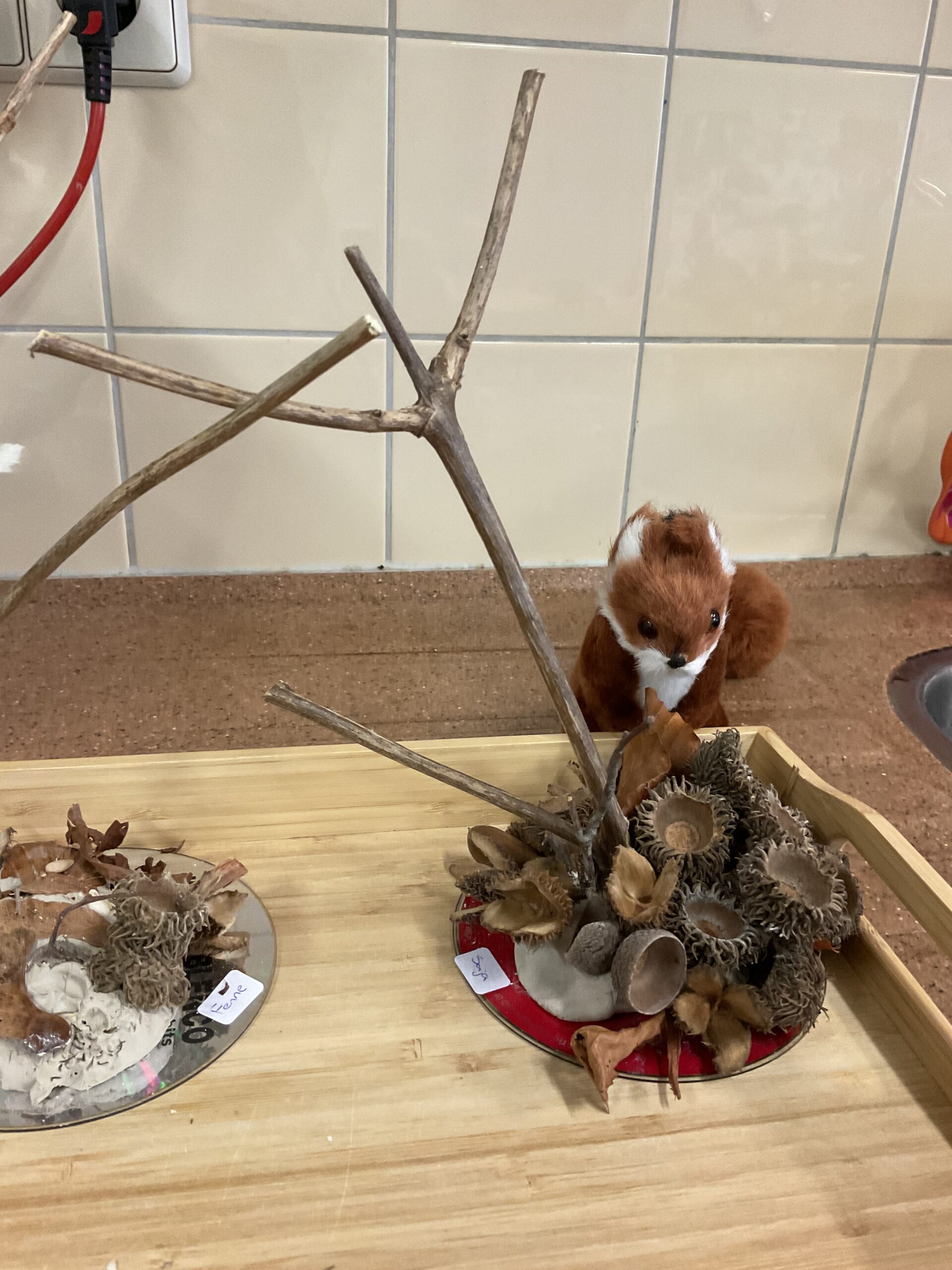 De kinderen maken een herfststukje met de spullen die ze in het bos hebben gevonden. Mooi he!