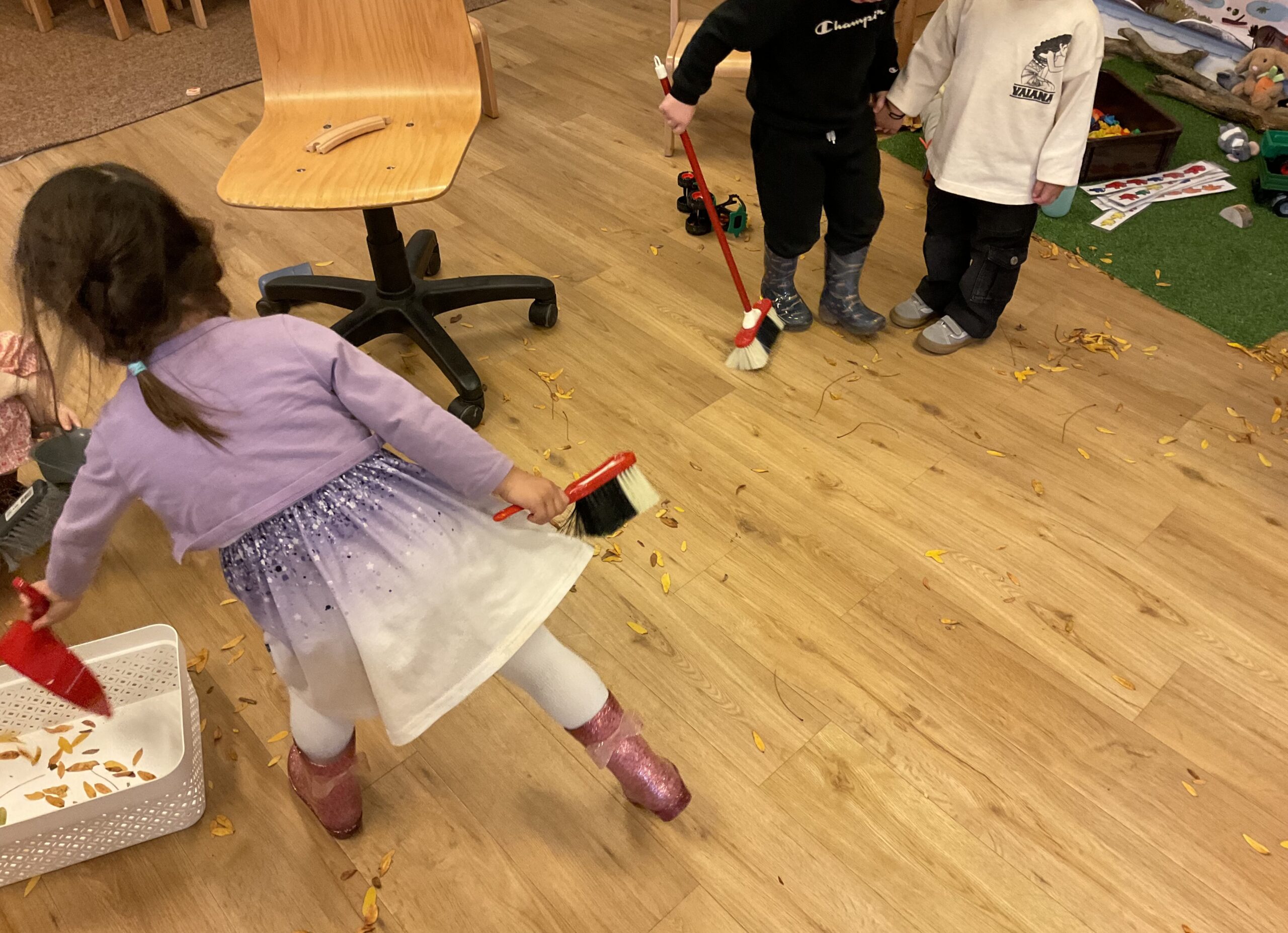 De wind blaast alle blaadjes naar binnen toe. Niets is leuker dan samen vegen en dan met de blaadjes gaan koken in de huishoek!