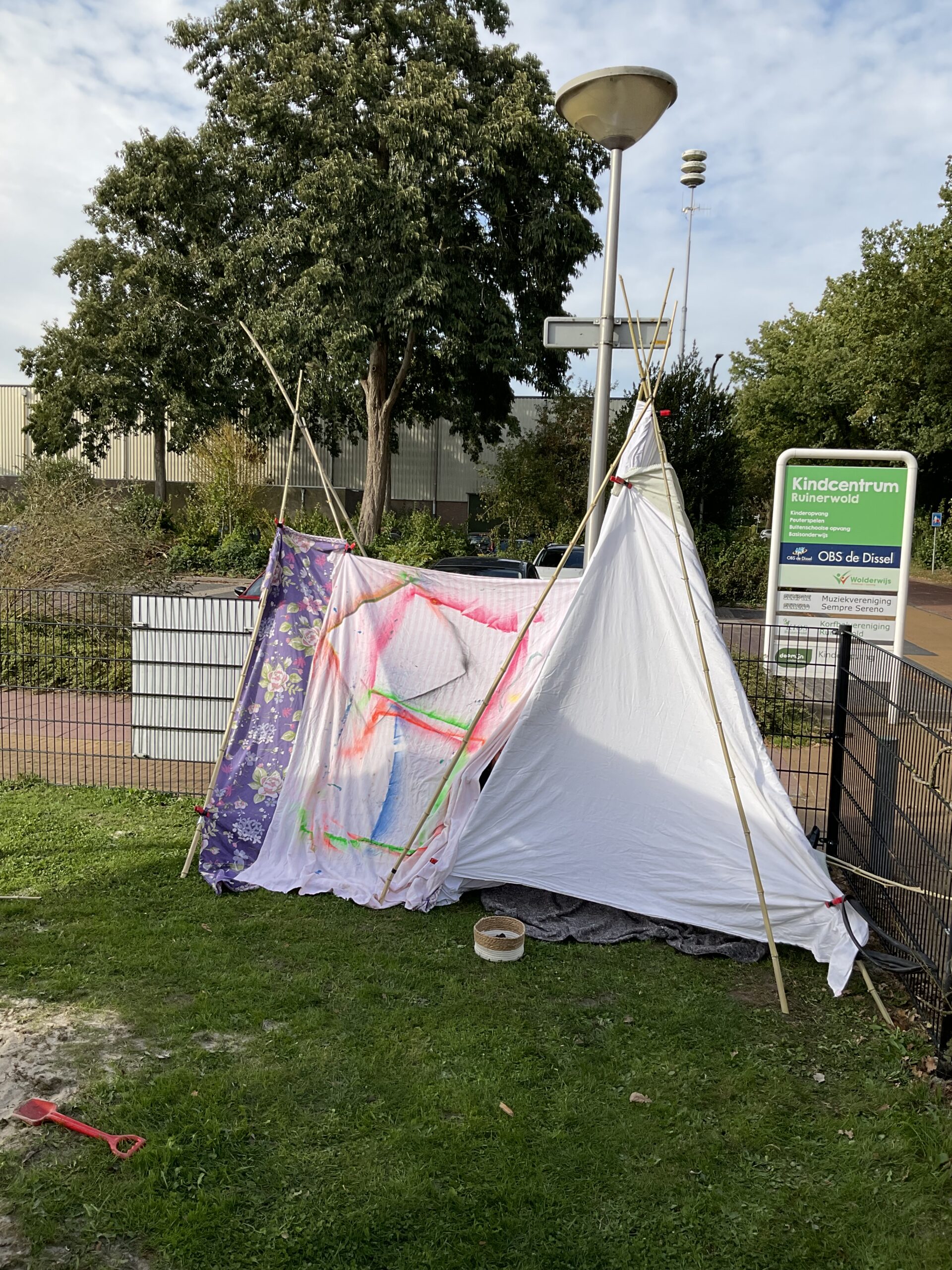 Heerlijk weer om een hut te bouwen met bamboestokken, grote knijpers, kleden en fietsbanden. Ondanks de harde wind blijft hij stevig staan.
