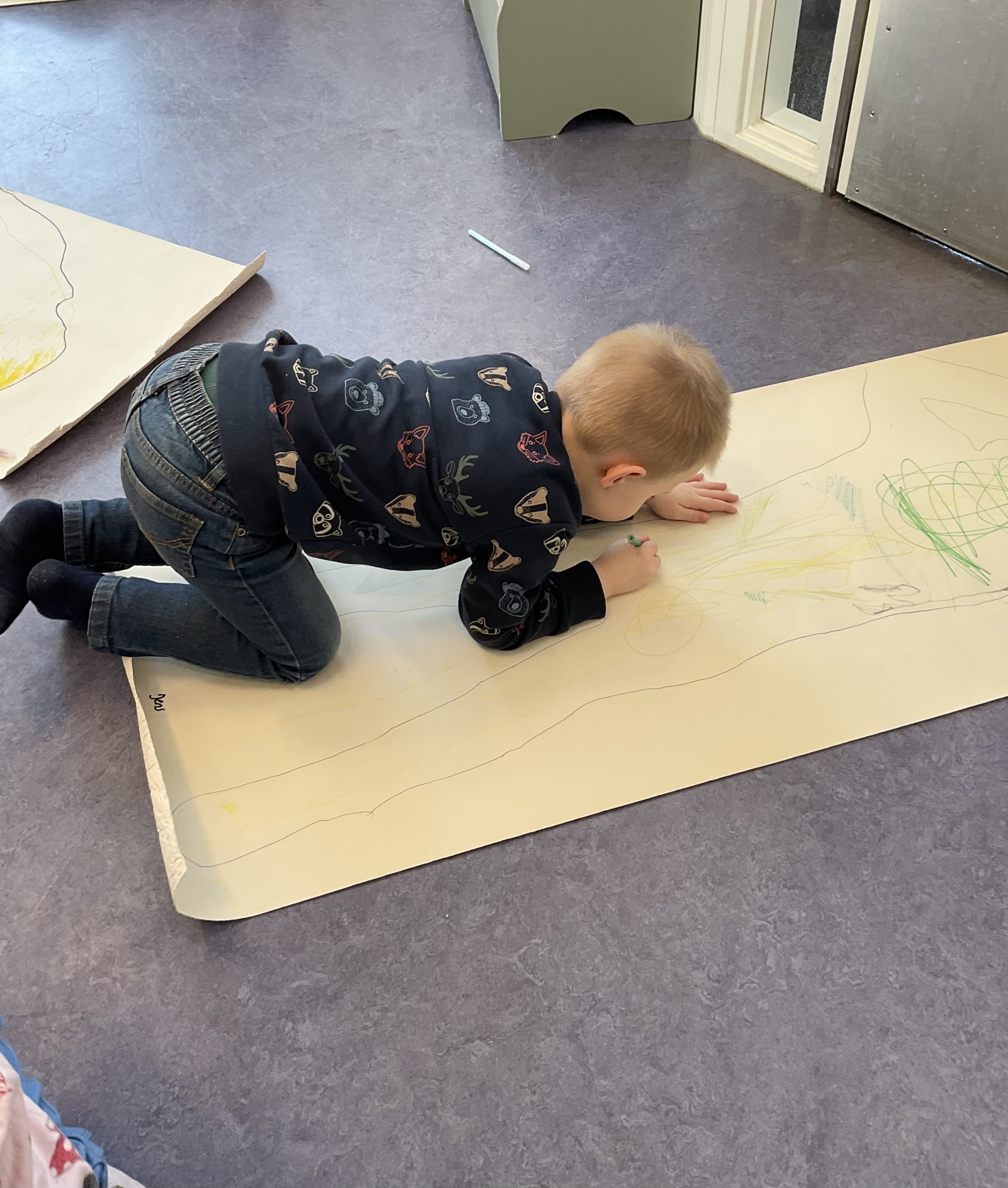 We zijn begonnen met het Thema ik ben ik. De peuters hebben op een groot stuk papier gelegen en zijn hun eigen omtrek aan het inkleuren. Sommige al met een echt gezicht met ogen, een neus en haar.