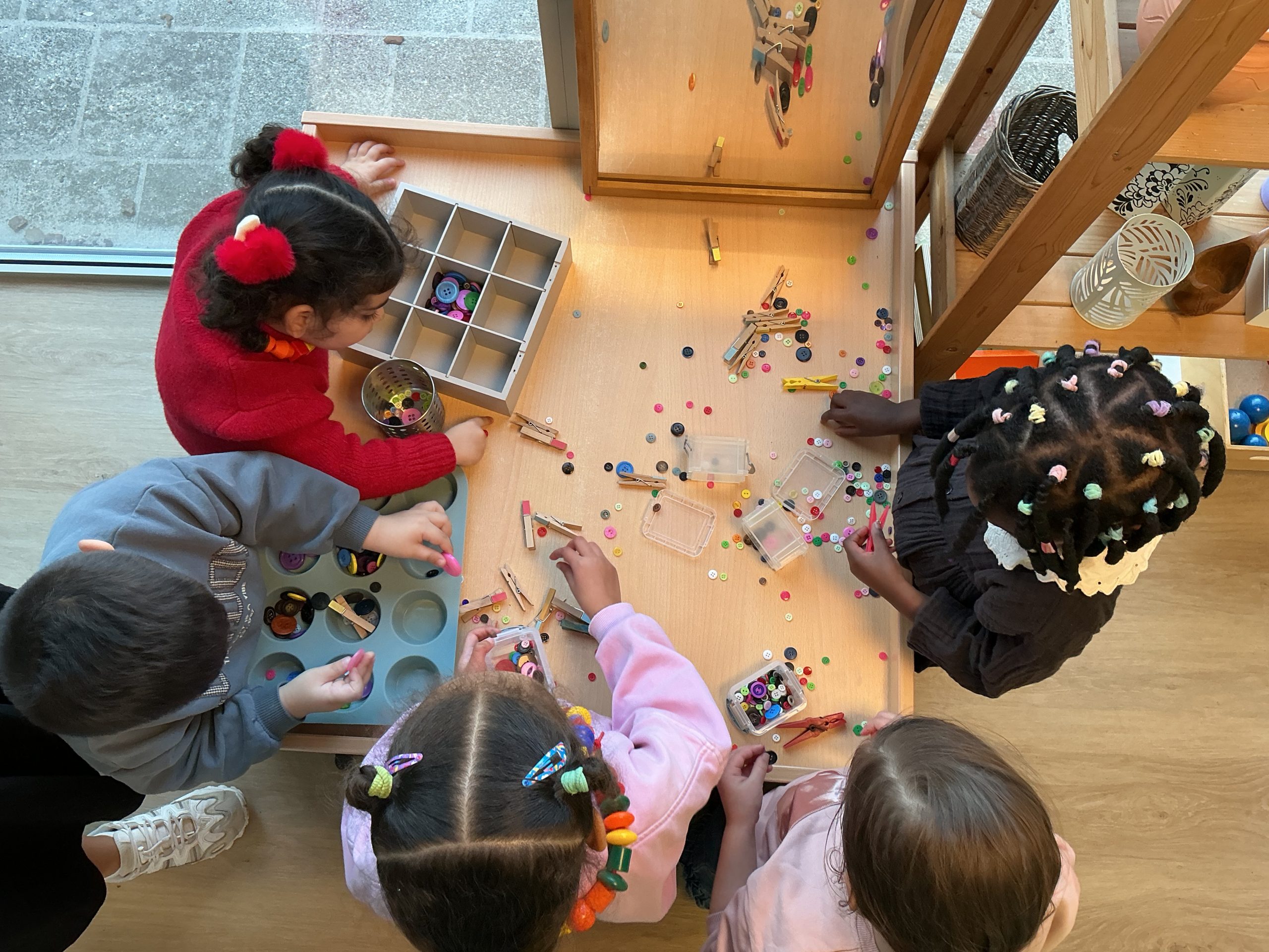 We spelen op de peuteropvang veel met loose parts. De kinderen bedenken zelf het mooiste spel of creatie! De gekleurde knopen kunnen we bijvoorbeeld sorteren of met een knijper pakken en in de bakjes doen.