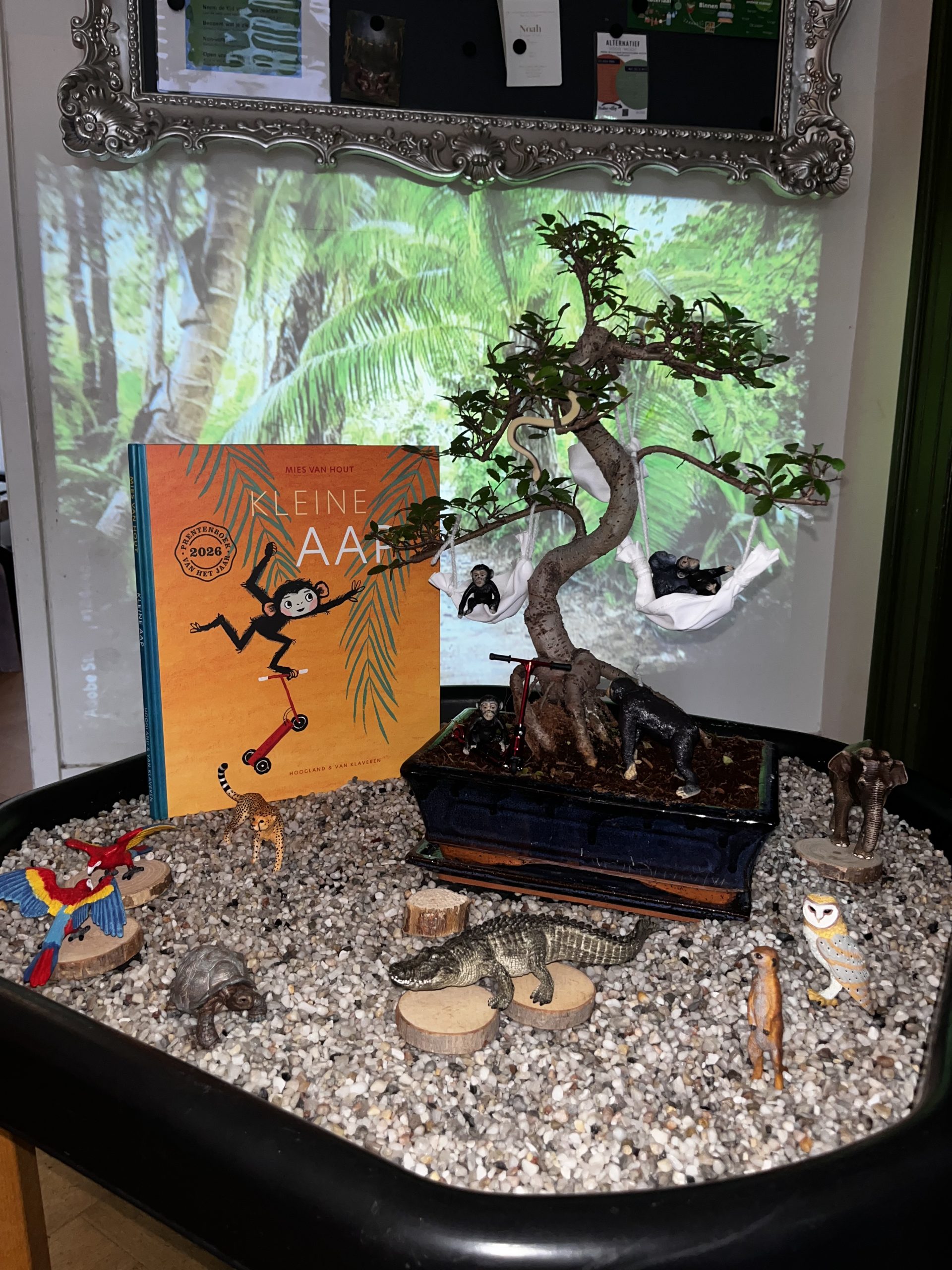 Onze voeltafel hebben we ingericht in net thema kleine aap.