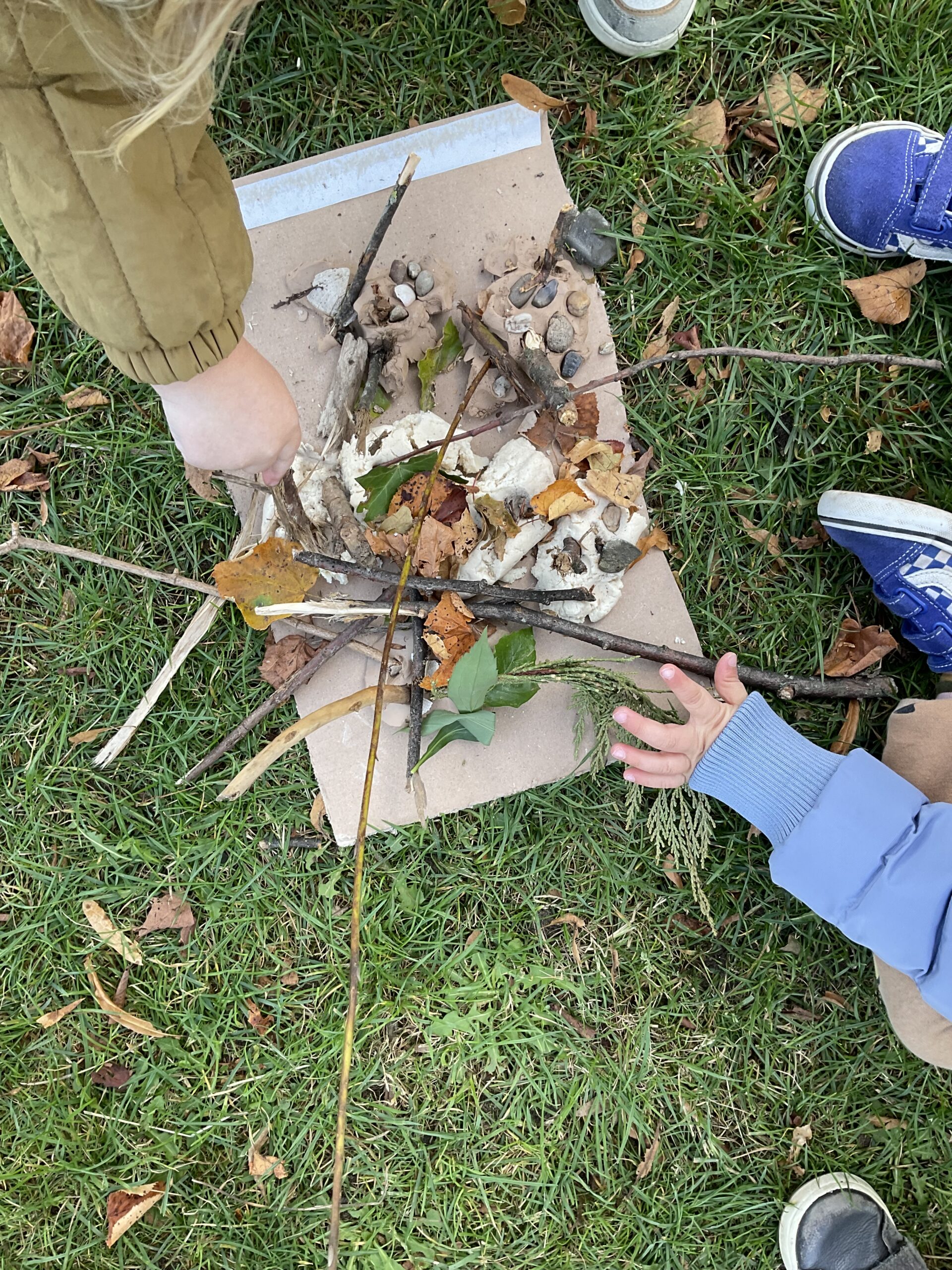 Vandaag een buiten activiteit. Met natuurklei en takjes, steentjes en blaadjes word er een gezamenlijk kunstwerk gemaakt.