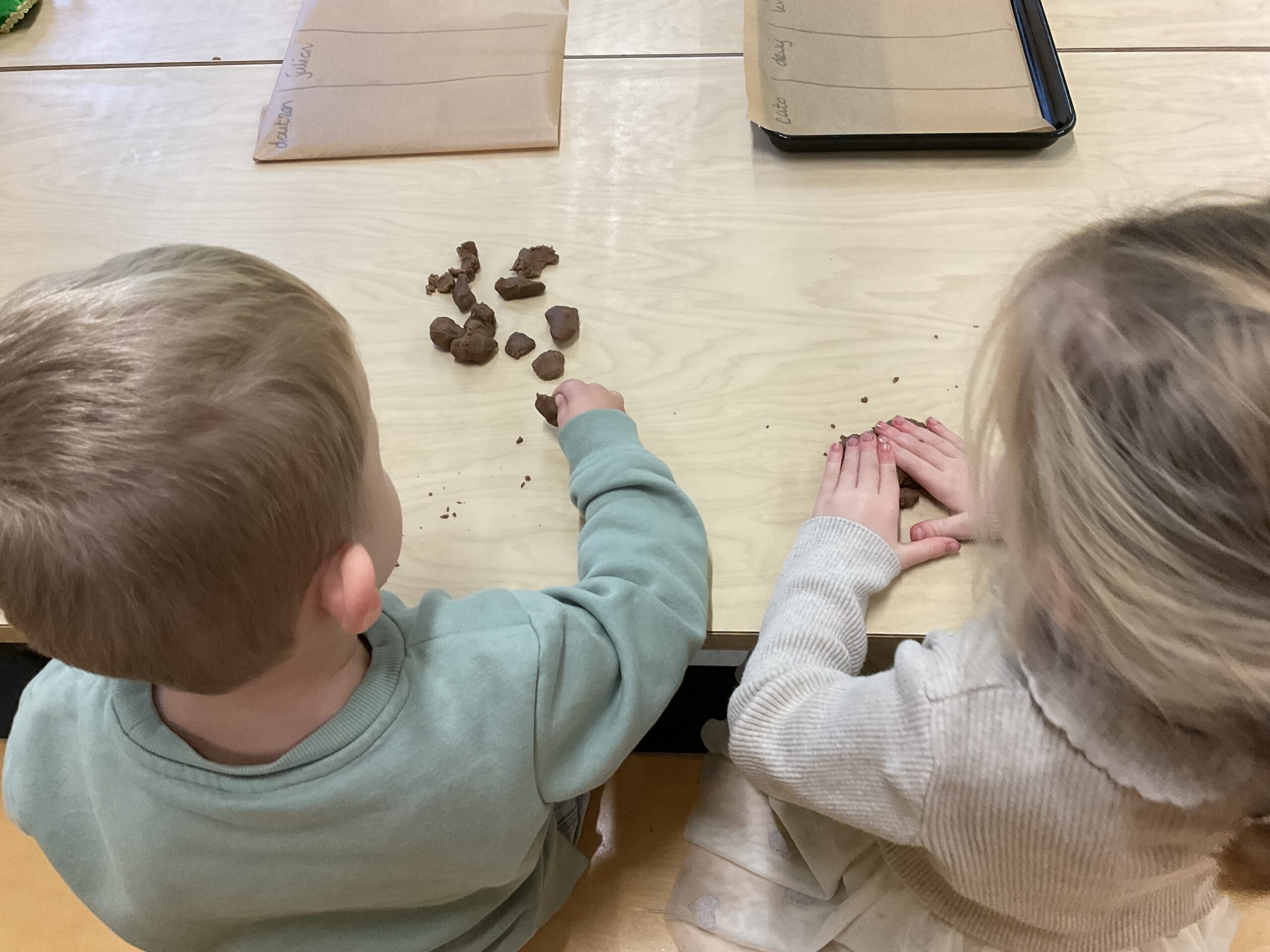 En ook vandaag bakken we nog een keer lekker pepernoten. Rondjes, slangetjes, grote, kleine, platte, we hebben een heleboel variatie in de vormen!