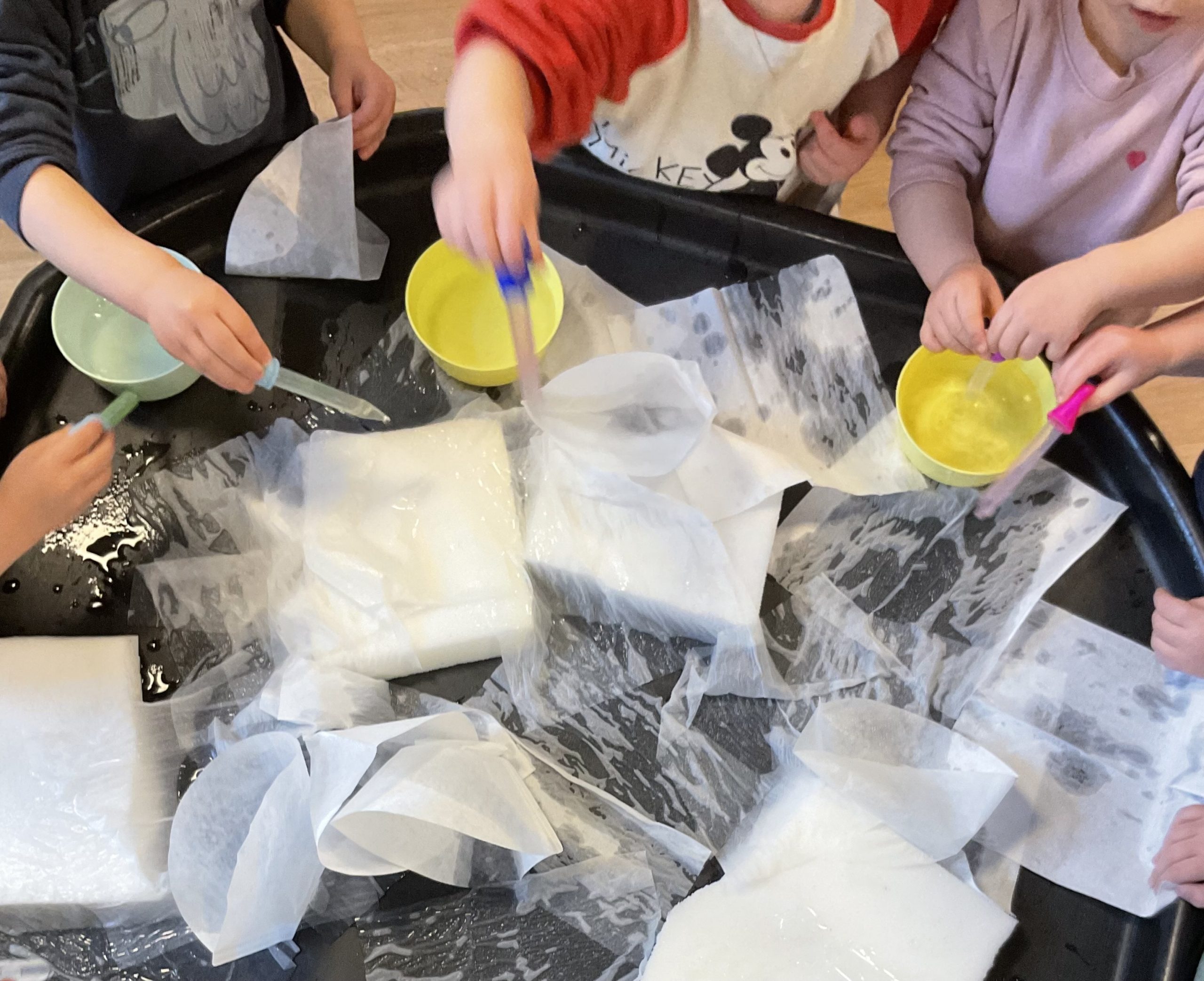 Met water, pipetjes, zakdoekjes, watjes en koffiefilters zijn we op ontdekking gegaan. Waar blijft het water op liggen, waar lekt het water door heen of waar trekt het water in? Een mooie ontdekking!