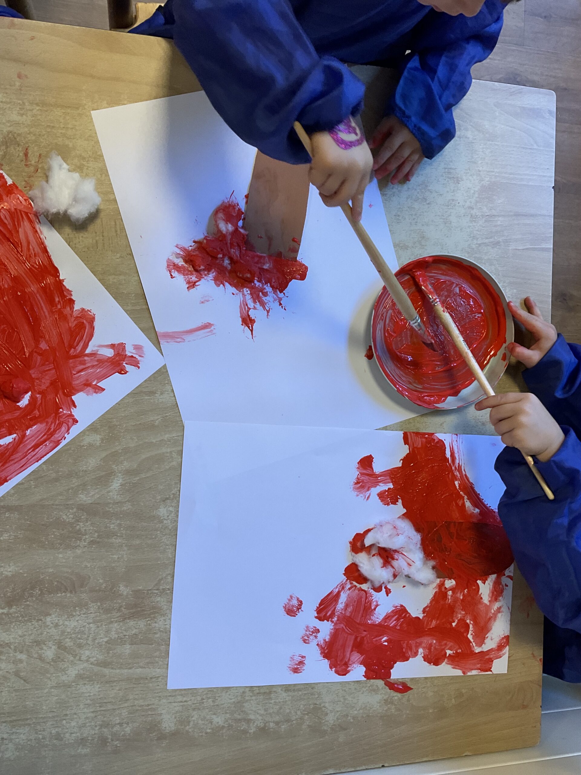 Wauw we zagen een mooie rood met witte paddenstoel. Dat bracht ons op ideeën! We hebben zelf een mooie paddenstoel geknutseld. Met papier, verf en watjes zijn er prachtige paddenstoelen gemaakt.