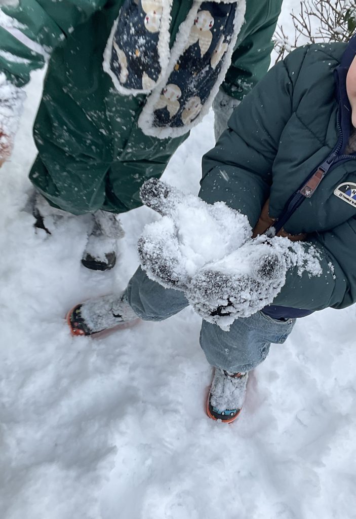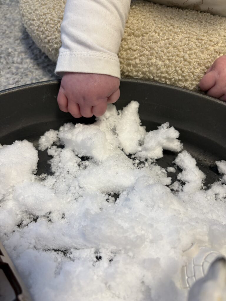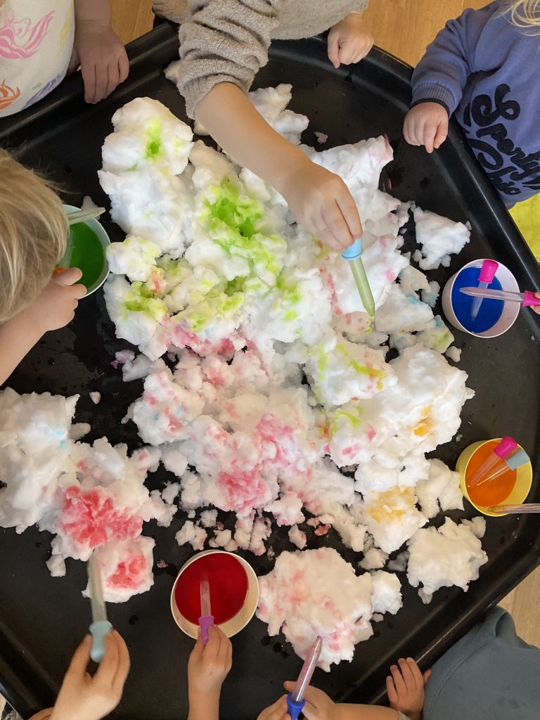 Niet alleen buiten hebben we sneeuw. We nemen ook de sneeuw mee naar binnen. We voelen aan de sneeuw en ontdekken dat de sneeuw smelt. Als activiteit krijgt de sneeuw een mooi kleurtje.