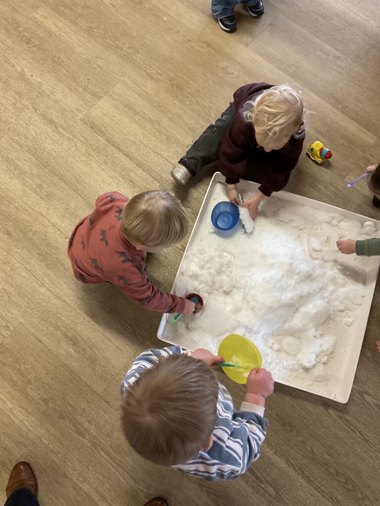 Brrr wat is het koud buiten. Zeker voor de kleintjes van de babygroepen. We halen de sneeuw naar binnen en daar kunnen we lekker voelen, proeven en scheppen.