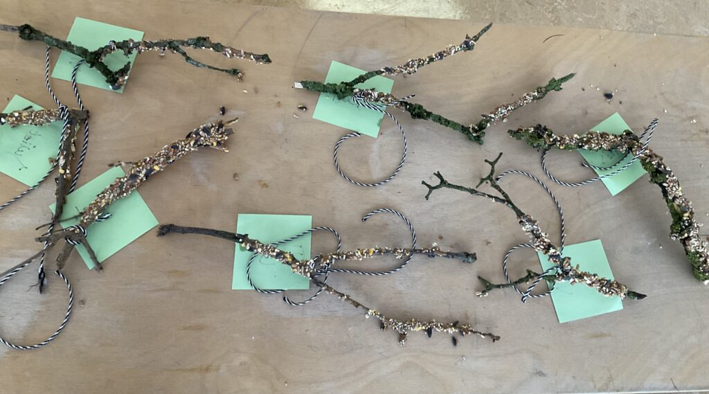 Er is veel sneeuw gevallen, de kinderen gaan de vogeltjes helpen door het maken van een vogelvoeder stokje.