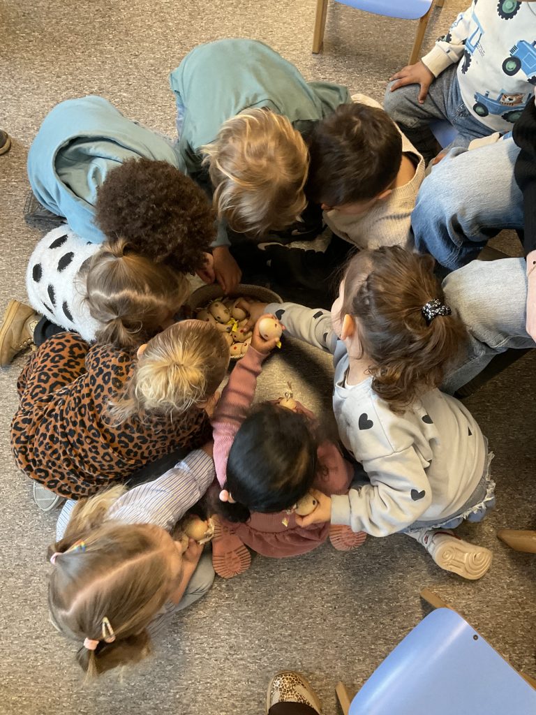 Wij kijken, wij voelen en wij zingen het liedje van: “Gele stippen op een ei met een mooi strikje erbij”
