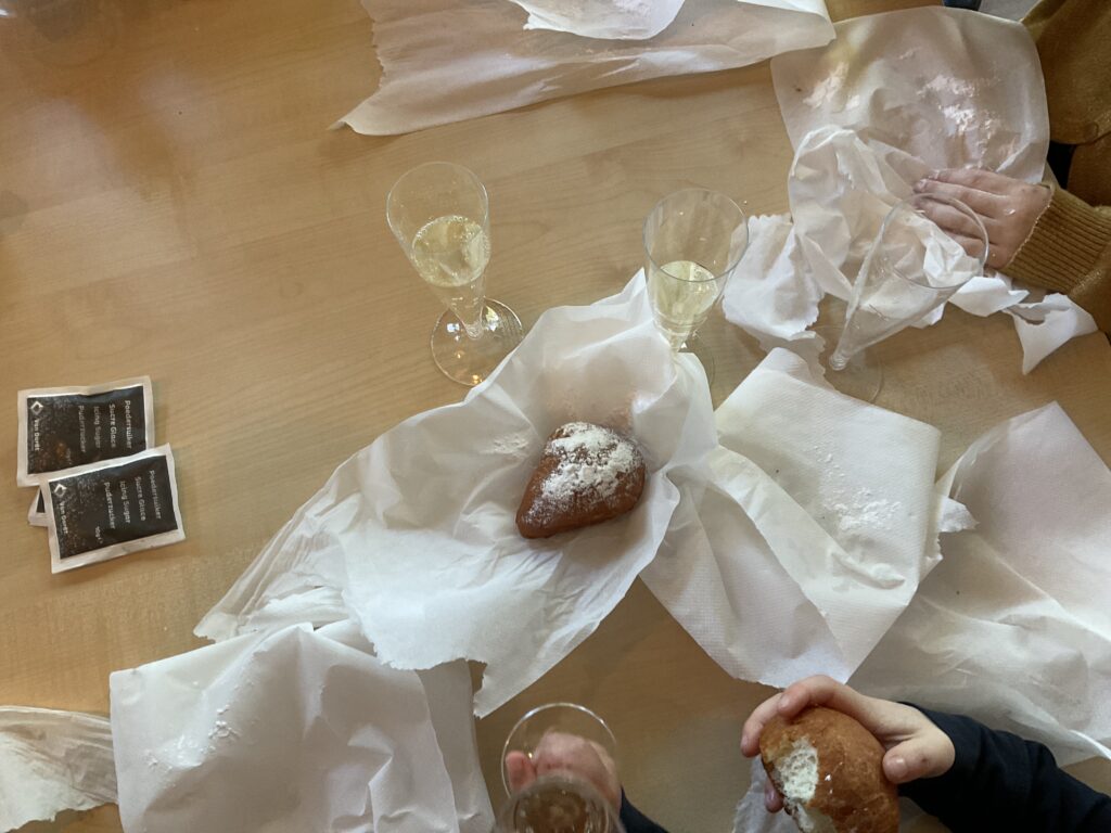 Vandaag zijn we gezellig samen naar de oliebollenkraam geweest. En daarna hebben we geproost met kinderchampagne!