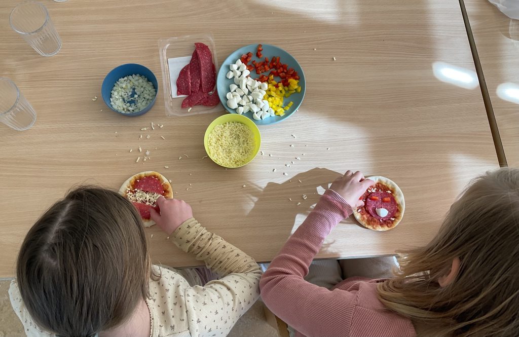 Eens in de week bakken of koken de kinderen op de bso. Vandaag hebben we mini pizza’s gemaakt. “Wat ruikt het hier lekker zeg”!