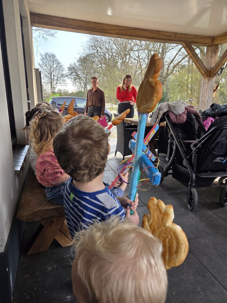 Elk jaar krijgen de kinderen een paasstok mee naar huis. Samen met hun ouders mogen ze deze versieren. Daarna gaan we met de peuteropvang naar de Bremhoeve in Kerkenveld, waar opa’s en oma’s wonen.