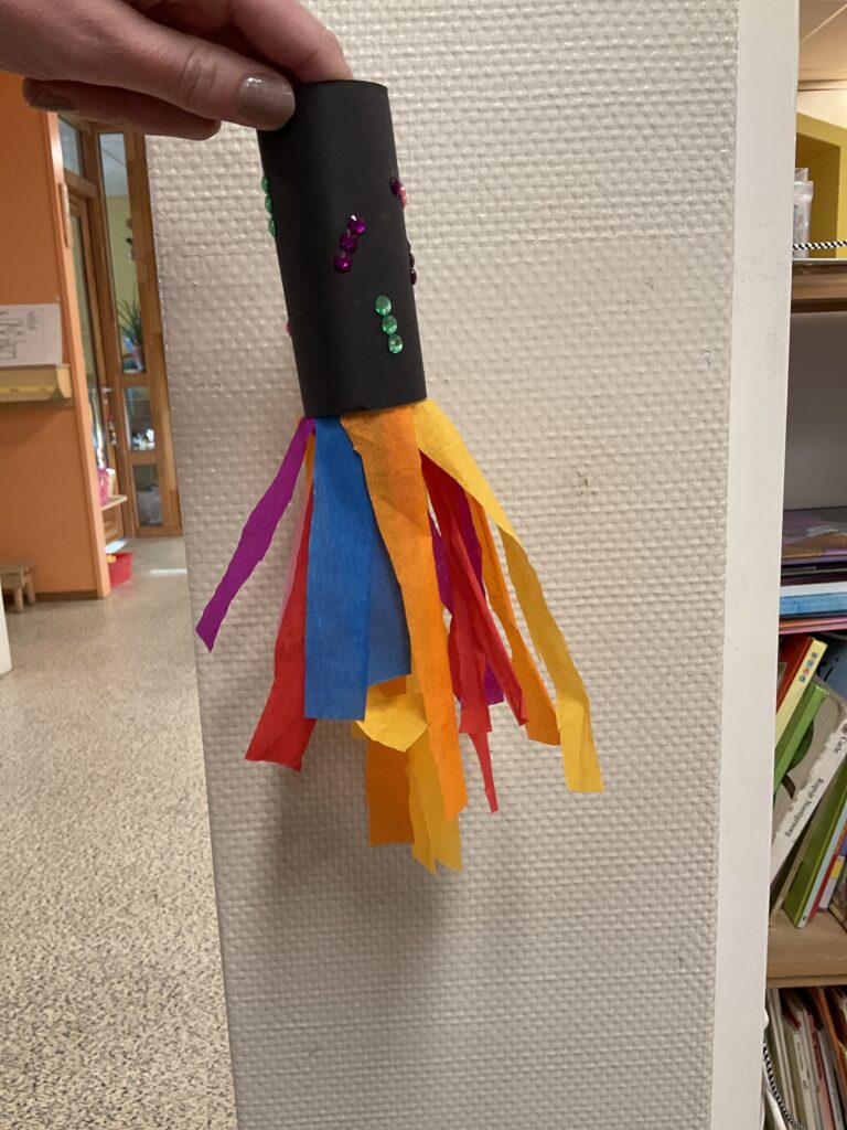 De kinderen op de bso maken met crêpepapier een blaasvuurwerk.