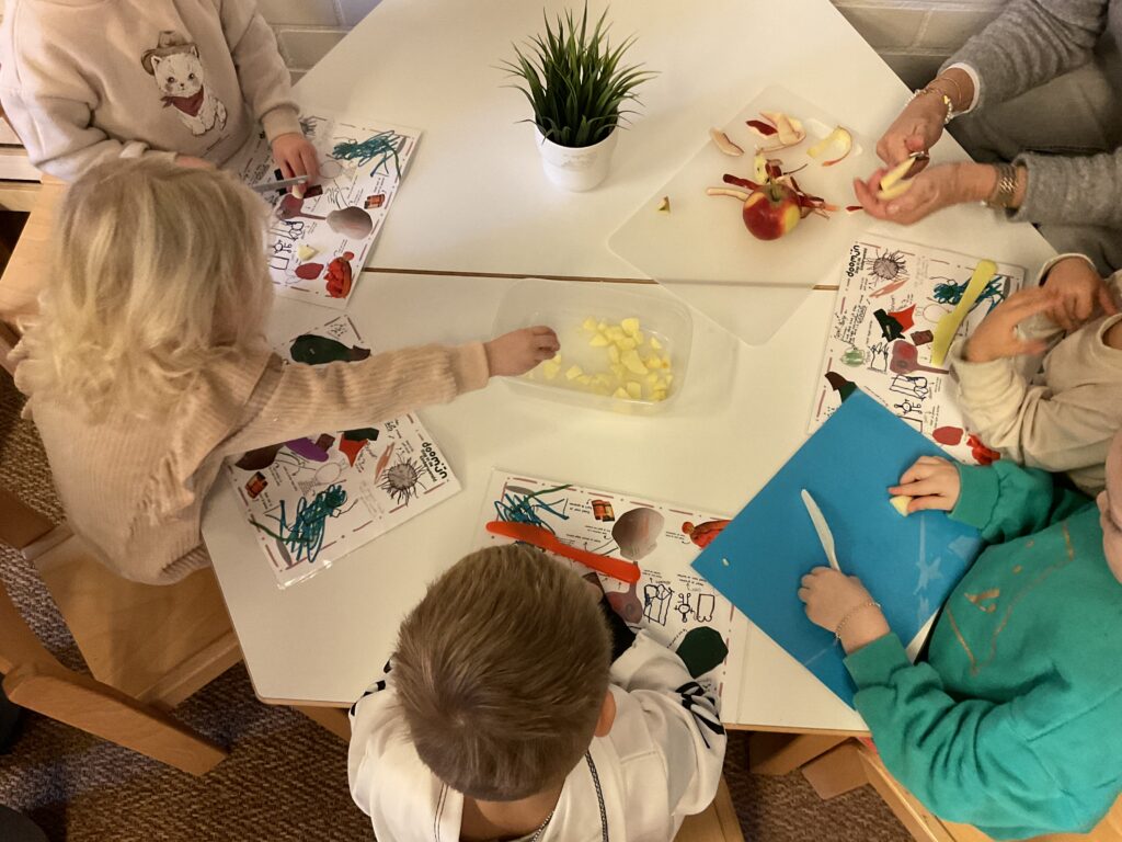 Vandaag kregen de kinderen allemaal een mes om de appels in stukken te snijden. Met een beetje kaneel erover ruikt het al heerlijk. Daarna hebben we er een appeltaart van gemaakt!