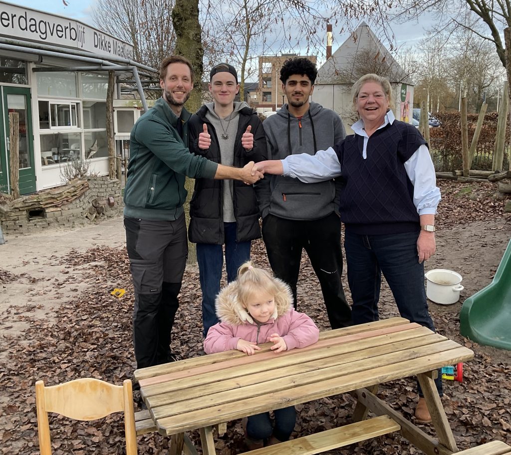 Een mooie samenwerking met VSO De Zonnehoek! Een school voor voortgezet speciaal onderwijs waar leerlingen praktijkgericht leren. Leerlingen van De Zonnehoek hebben voor ons stoeltjes geschuurd en gelakt en een picknicktafel gerepareerd. Een fijne samenwerking waar we trots op zijn, voor de leerlingen én voor onze kinderen!