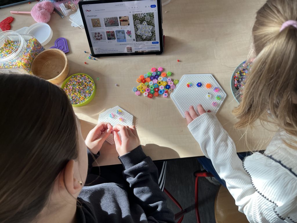 De kinderen genieten van de sfeer op de bso en de zon die door het raam schijnt. Dus een mooie dag om bloemetjes te maken van strijkkralen!
