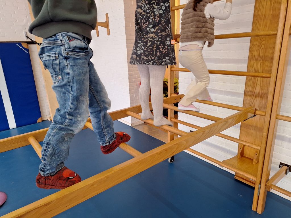 De oudste kinderen mogen vanaf 3 jaar af en toe een kijkje nemen op de basisschool. Vandaag doen ze mee met gymmen!