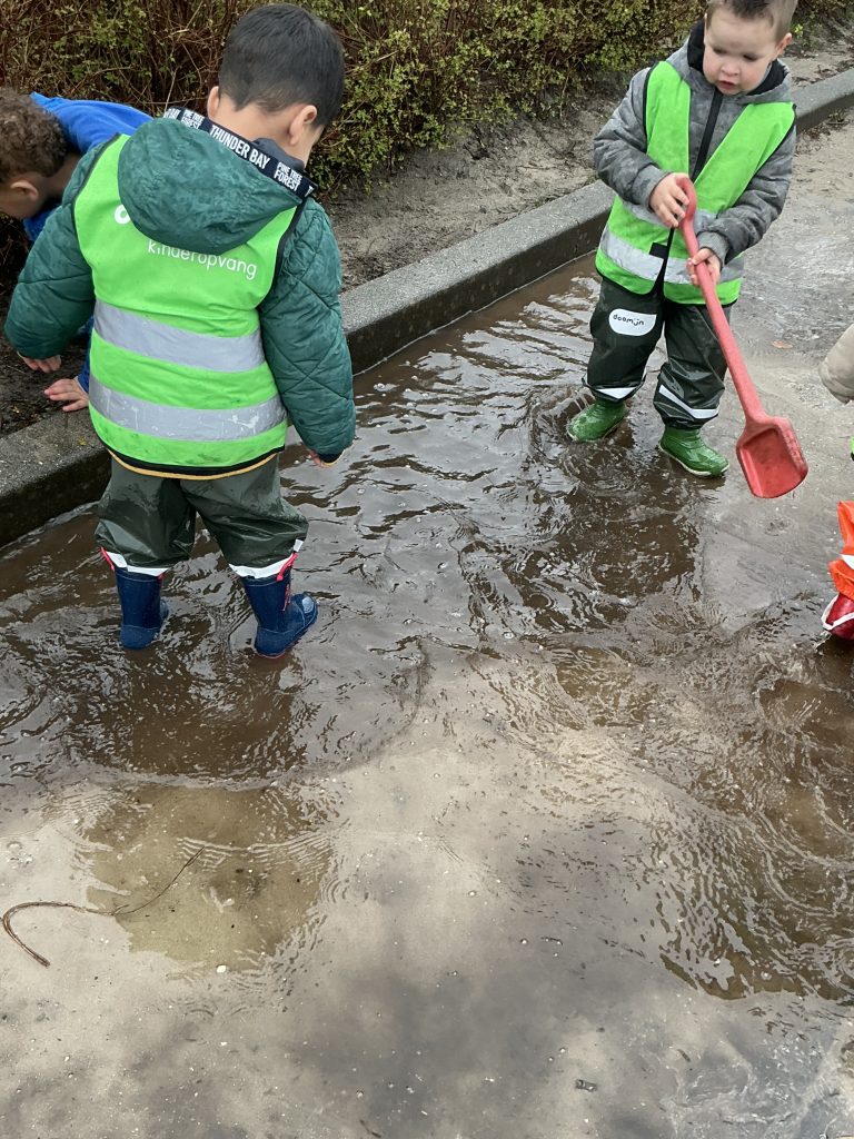 Slecht weer kennen wij bij De Ploeg niet! Met de laarsjes aan gaan we naar buiten, lekker springen en spetteren in de plassen.