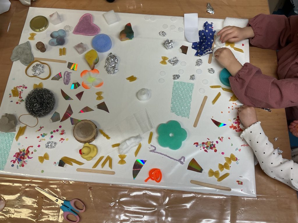 De kinderen mochten zelf allerlei materialen op een schilderij plakken! En dat vonden ze superleuk om te doen!
