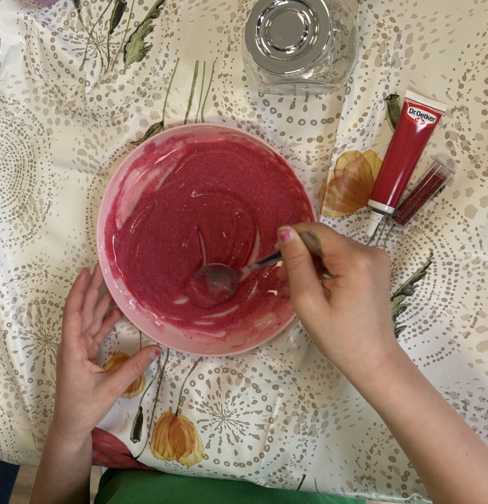 De kinderen van groep DJ’s spelen graag met slijm. Maar hoe leuk is het om het zelf te maken? Vandaag gingen we aan de slag met maïzena, lijm, lenzenvloeistof, kleurstof en glitters. Wat een geklieder en plezier!