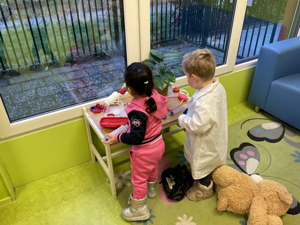We zitten in de laatste week van het thema ziek en gezond. Elke dag lopen er dokters door de klas en krijgen kinderen, poppen én leidsters een prik of een pleister. Wat een zorgzame drukte!