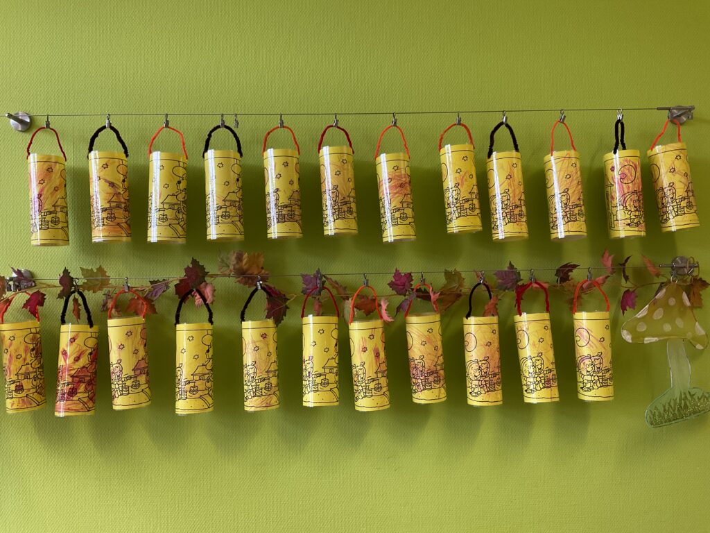 De lampionnen hangen klaar om mee naar huis te gaan. Met wasco en ecoline hebben we Tomke versierd. Daarna de lampion gelamineerd, zodat hij waterproof is. Regen of niet, onze lampion kan er tegen!