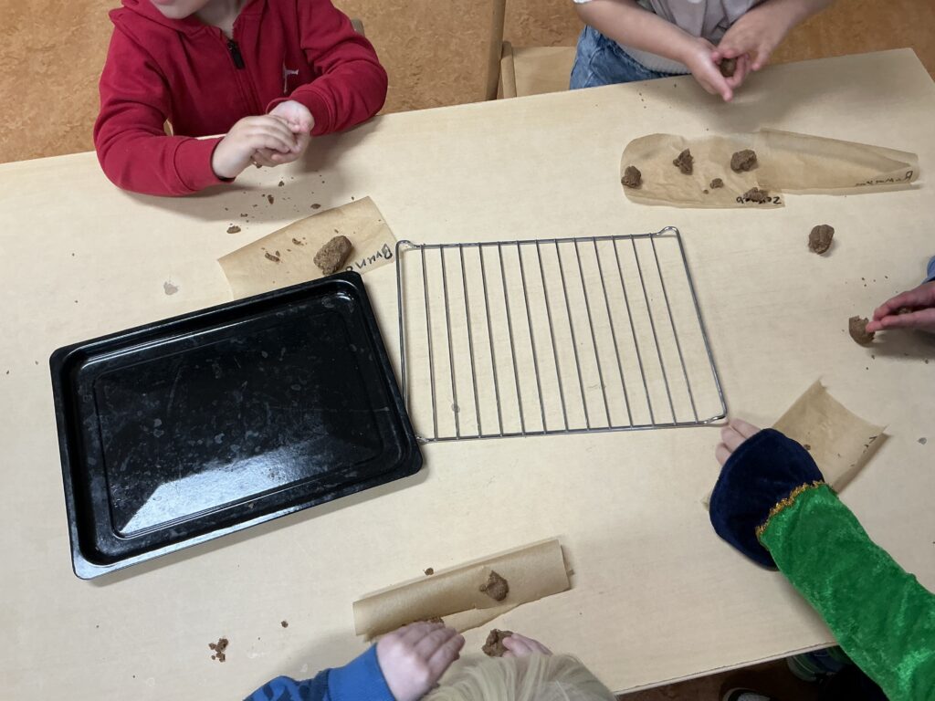 Vandaag hebben we pepernoten gebakken. Eerst het deeg gekneed en daarna pepernoten gemaakt. Daarna in de oven en smullen maar!