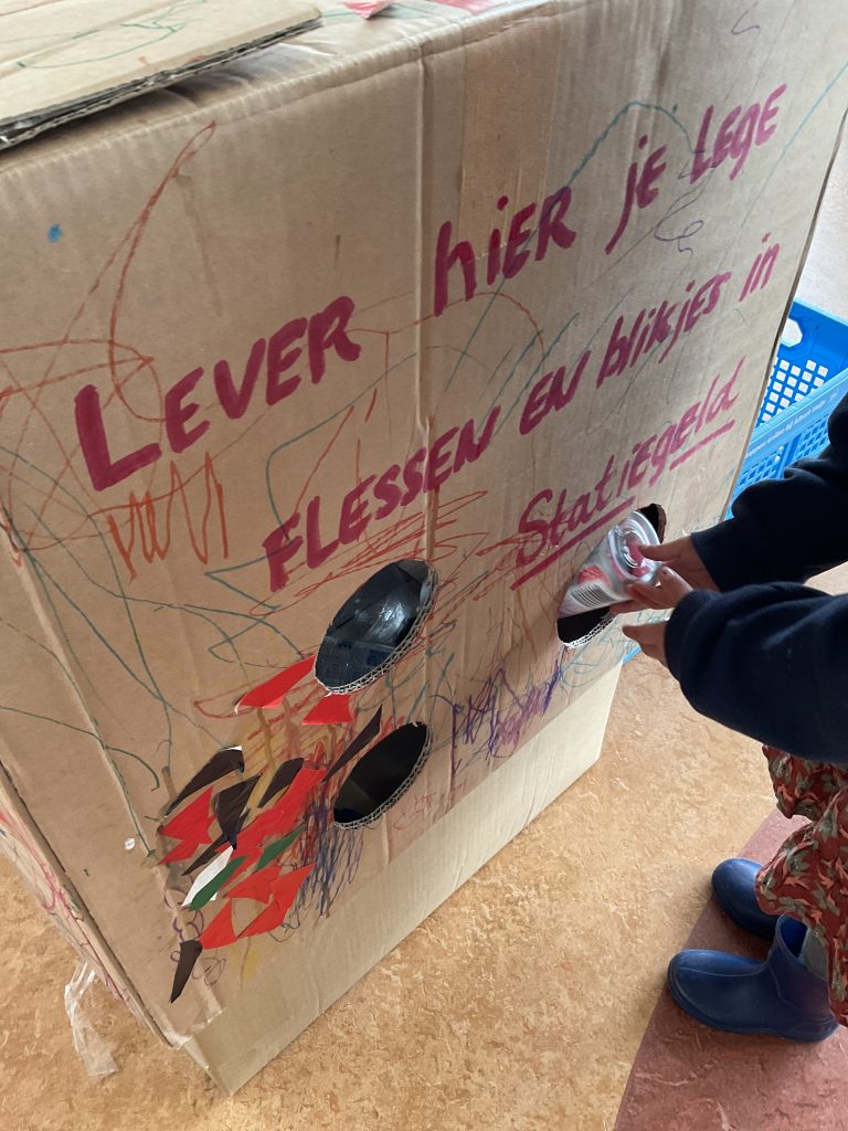 Samen met de kinderen maakten we onze eigen statiegeldautomaat. Wat een leuk idee! Nu kunnen we flessen en blikjes ‘inleveren’ tijdens het spelen.
