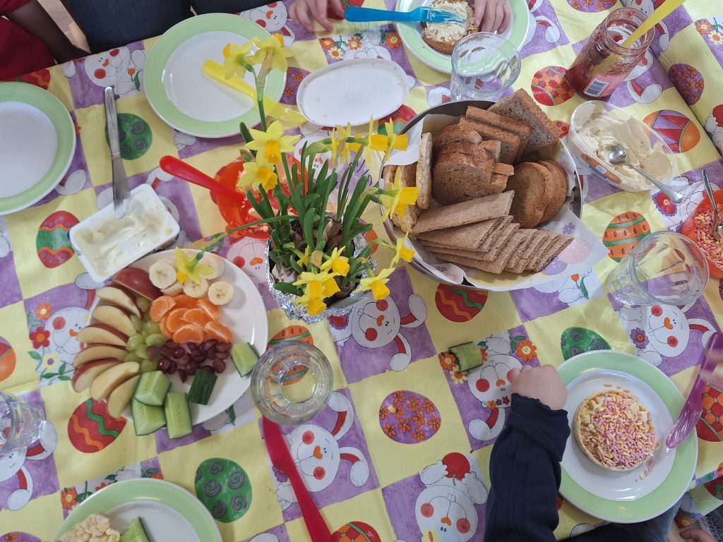 We dekken de tafel gezellig en smullen van al het lekkers dat klaar staat!