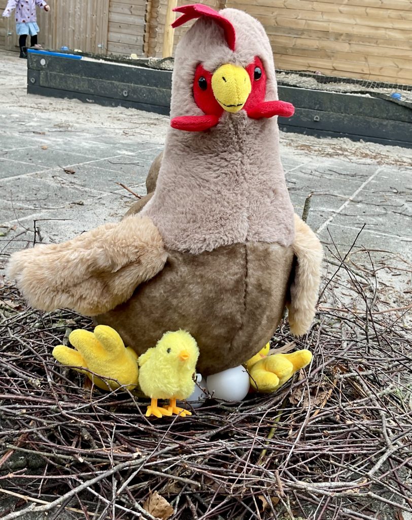 Het kippenhok ligt vol met eieren en kuikens. Dottie zorgt goed voor ze.