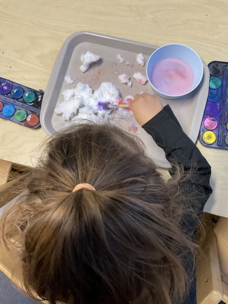 Buiten sneeuwt het hard door, binnen spelen we met bakken sneeuw en lepels.