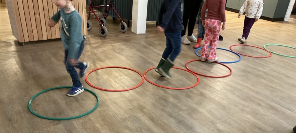 Vanmorgen gingen we met 7 kinderen op visite bij Het Vonder. Daar speelden we met hoepels en zongen we samen liedjes. Het was een gezellig bezoekje!