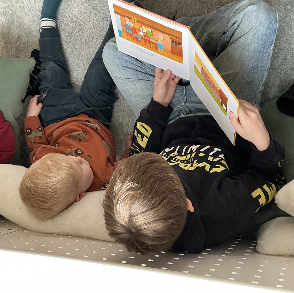 Groep 8 kwam langs om een boekje voor te lezen aan de kinderen. Ze luisterden aandachtig en genoten van de verschillende verhalen!