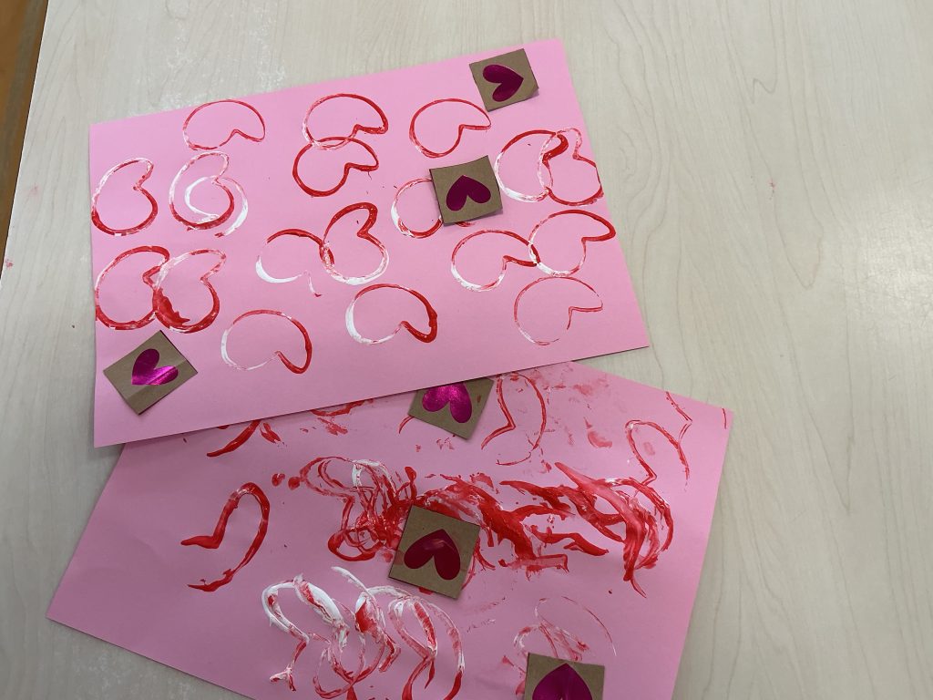 Morgen is het Valentijnsdag, dus vandaag versieren we hartjes om die morgen te geven aan iemand die de kinderen lief vinden.